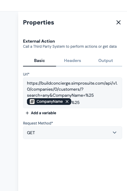 The below is an example of how you’d configure the External Action node to dynamically search for a Company in Simpro: