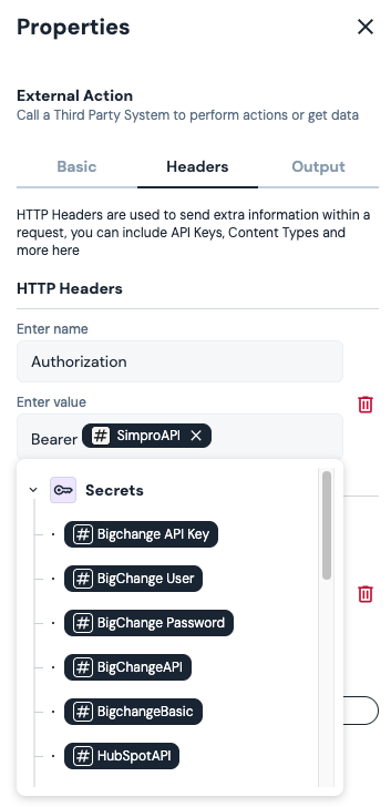 - In the Enter value field, insert ‘Bear [SecretHoldingBigChangeAuth]’, with the placeholder replaced by the preconfigured secret holding the base64 encoded BigChange Username and Password.